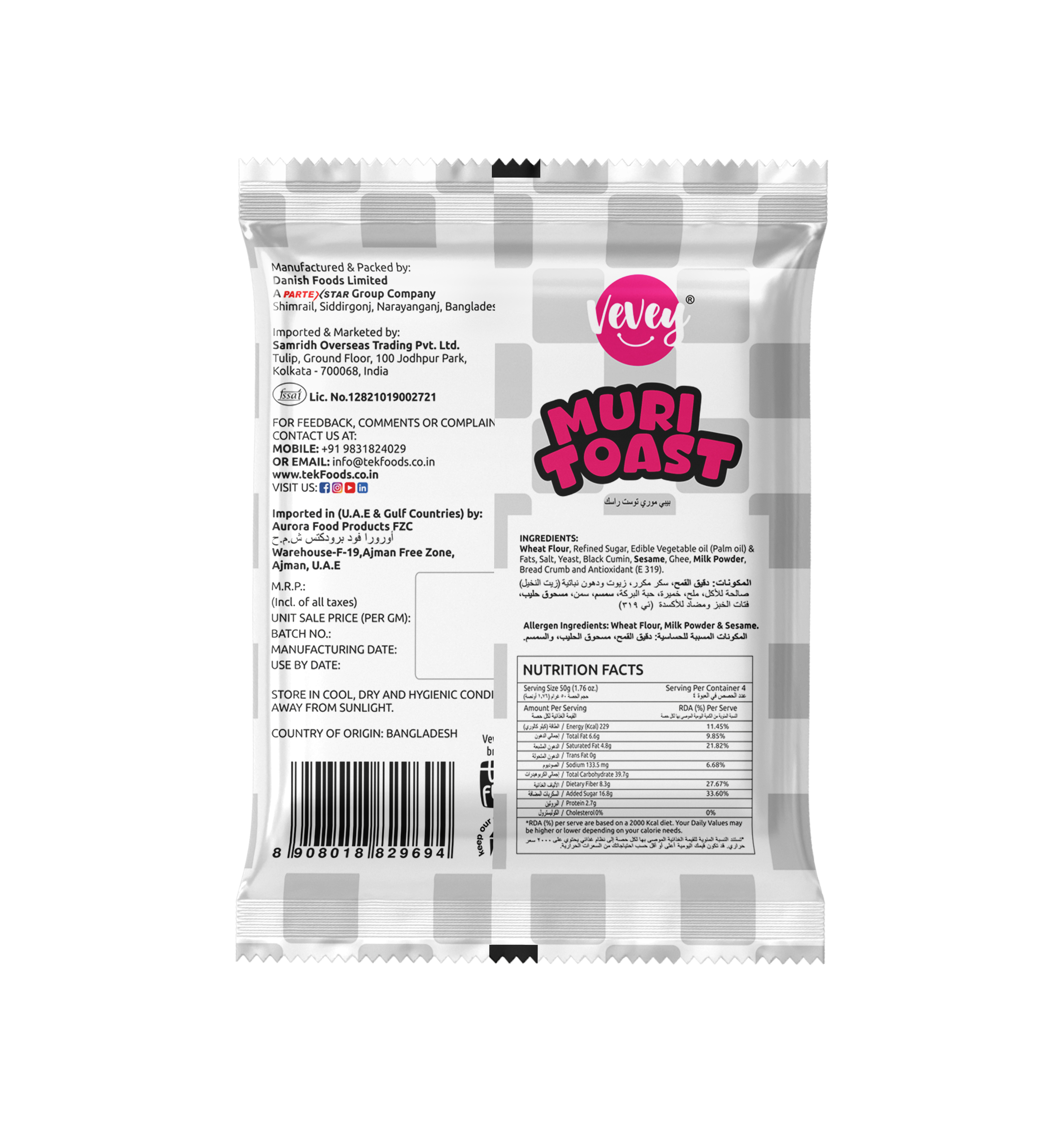 Refined Wheat Flour (Maida), Sugar, Edible Vegetable Oil (Palm Oil), Whole Milk Powder, Butter Oil, Edible Common Salt, Yeast, Black Cumin Seed and Sesame.